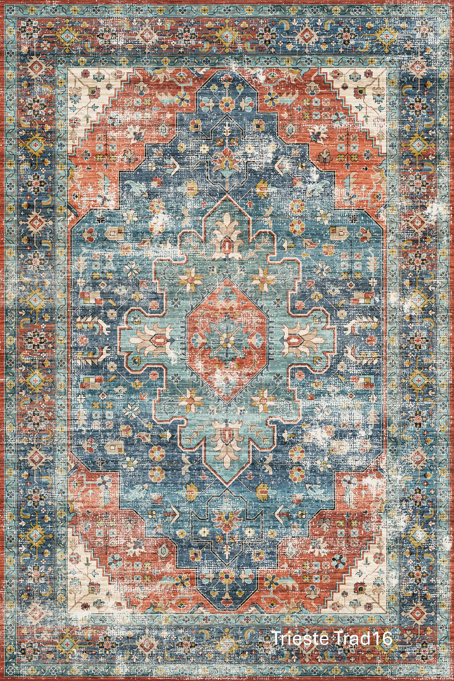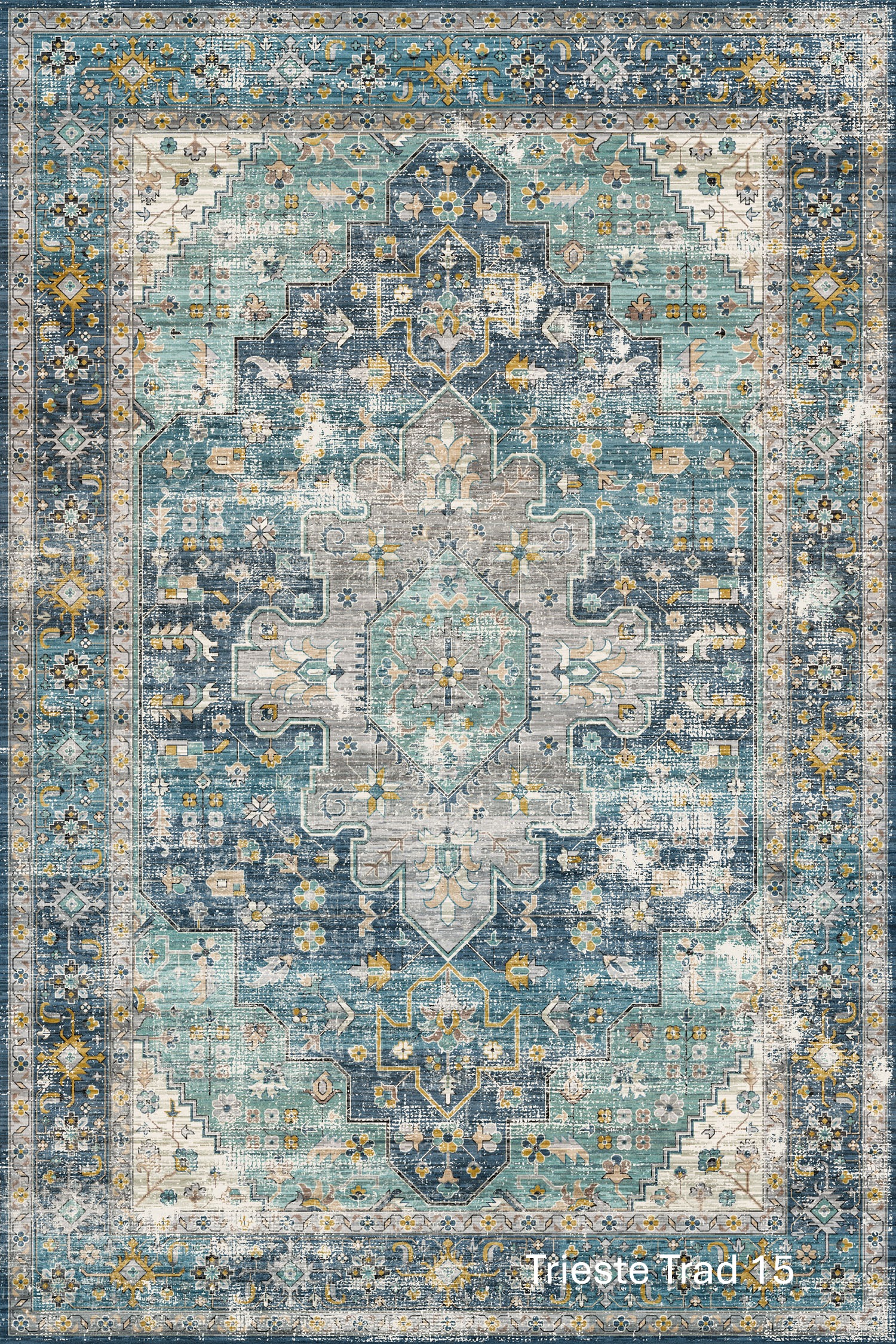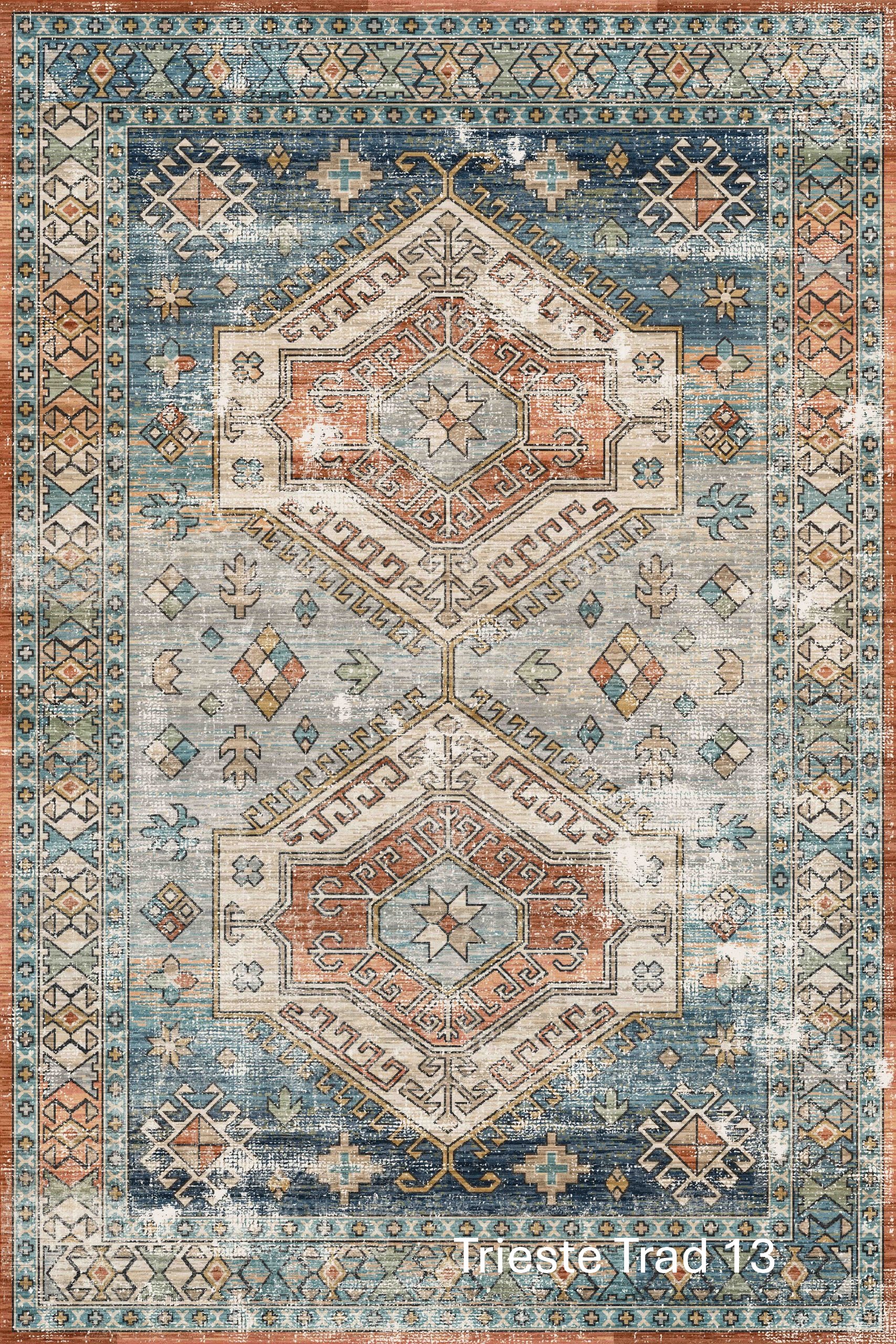 Trieste showcase richly detailed, vintage-inspired designs with a beautifully soft, contemporary finish. Featuring traditional motifs, geometric medallions, and decorative borders, Trieste blends classic character with a gently distressed look that feels both timeless and relaxed. The layered patterns and muted colour variations create depth and warmth, making each rug a statement piece without overwhelming the space.